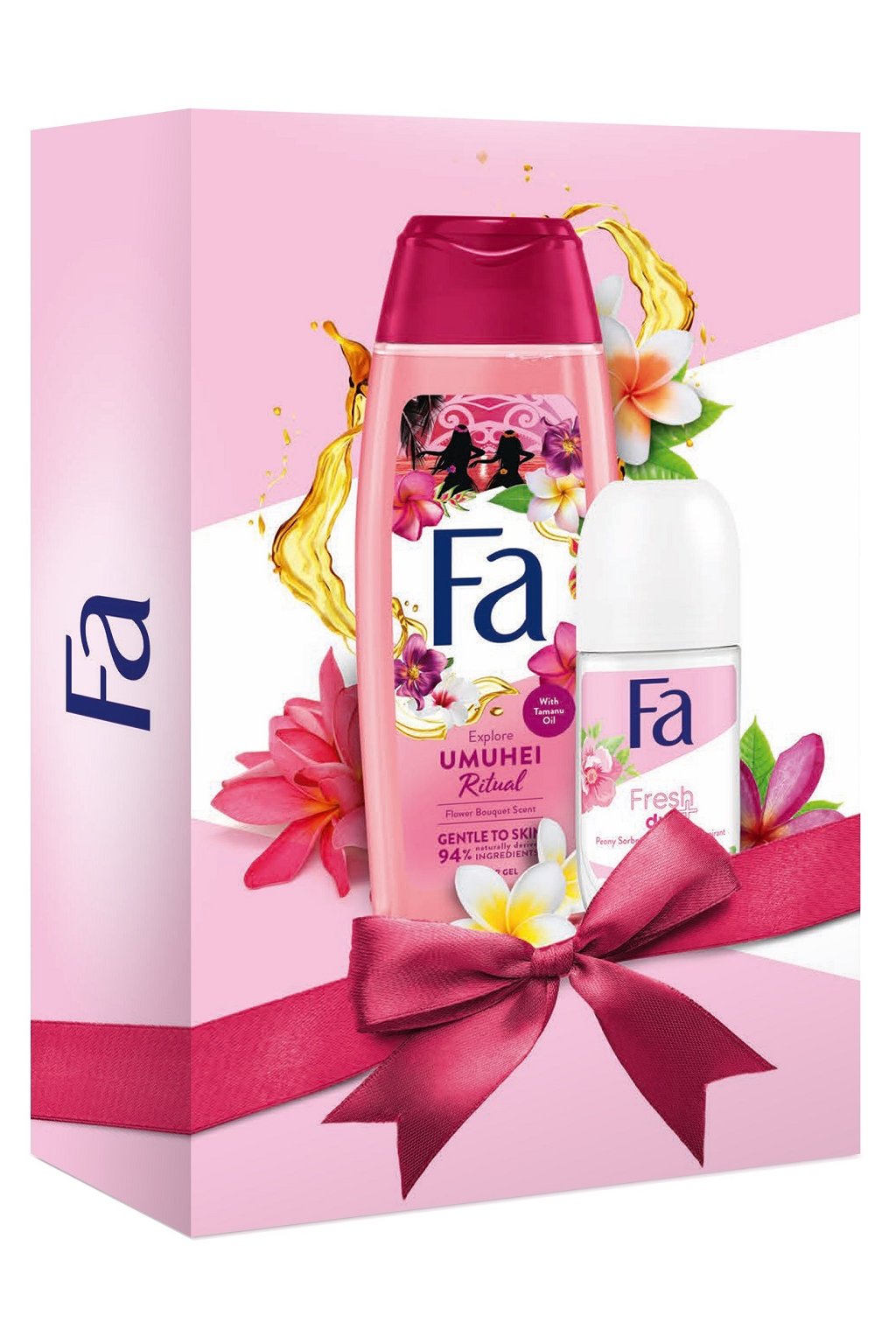 Dárková sada Fa Umuhei Peony představuje skvělou kombinaci dvou pečujících dárků. Sadu tvoří sprchový gel a antiperspirant značky Fa. Tato sada okouzlí vás nebo někoho, koho milujete, relaxační vůní exotických květin, uzavřenou ve sprchovém gelu a kuličkovém antiperspirantu, zabalenou v krásné, dekorativní krabici.