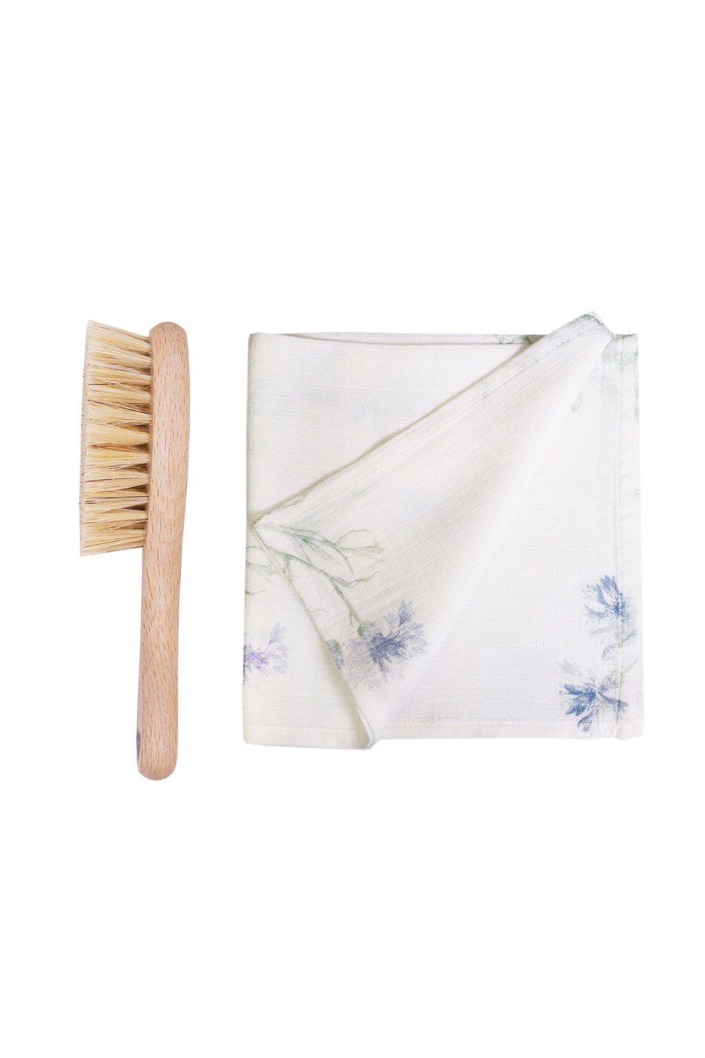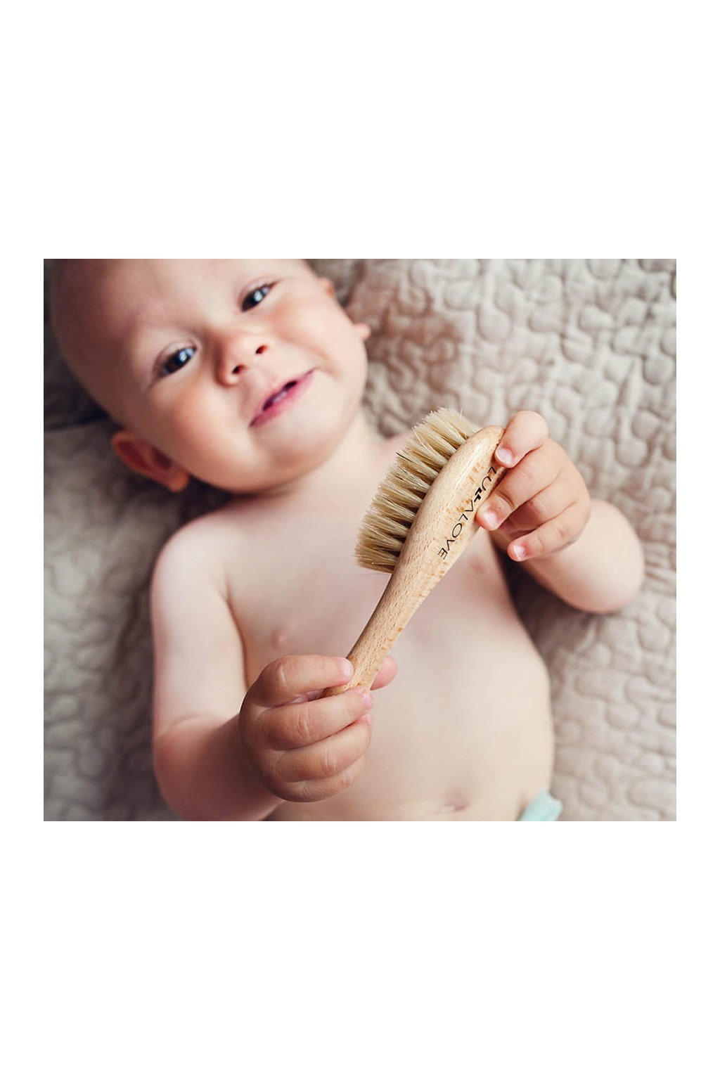 Ideální pro česání vlasů, užitečné, jak se zbavit suché kůže na hlavičce miminka. Malý kartáč s přírodními štětinami s dokonalou tvrdostí přizpůsobenou dětské pokožce. Dokonalý k česání a masáže pokožky hlavy pomáhají proti ztmavnutí. V sadě s jemným, mušelínovou žínkou, který bude pracovat v každodenní péči o Vašeho andílka.